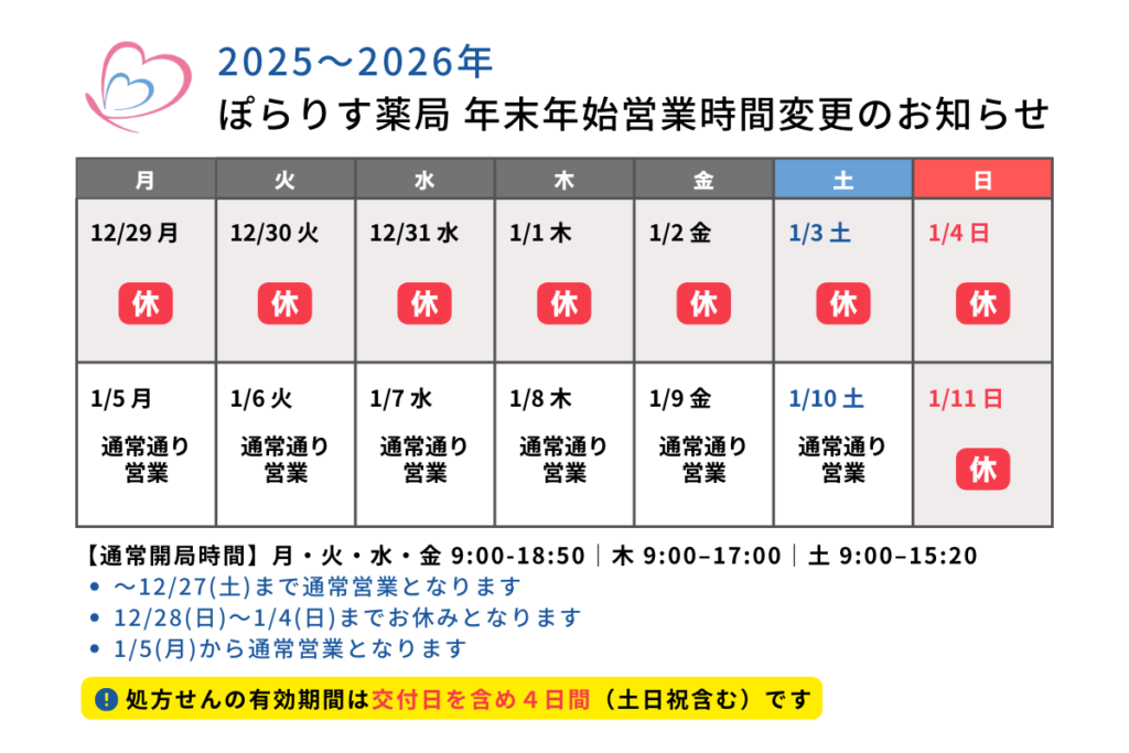 ぽらりす薬局 2025年〜2026年年末年始営業時間のお知らせ